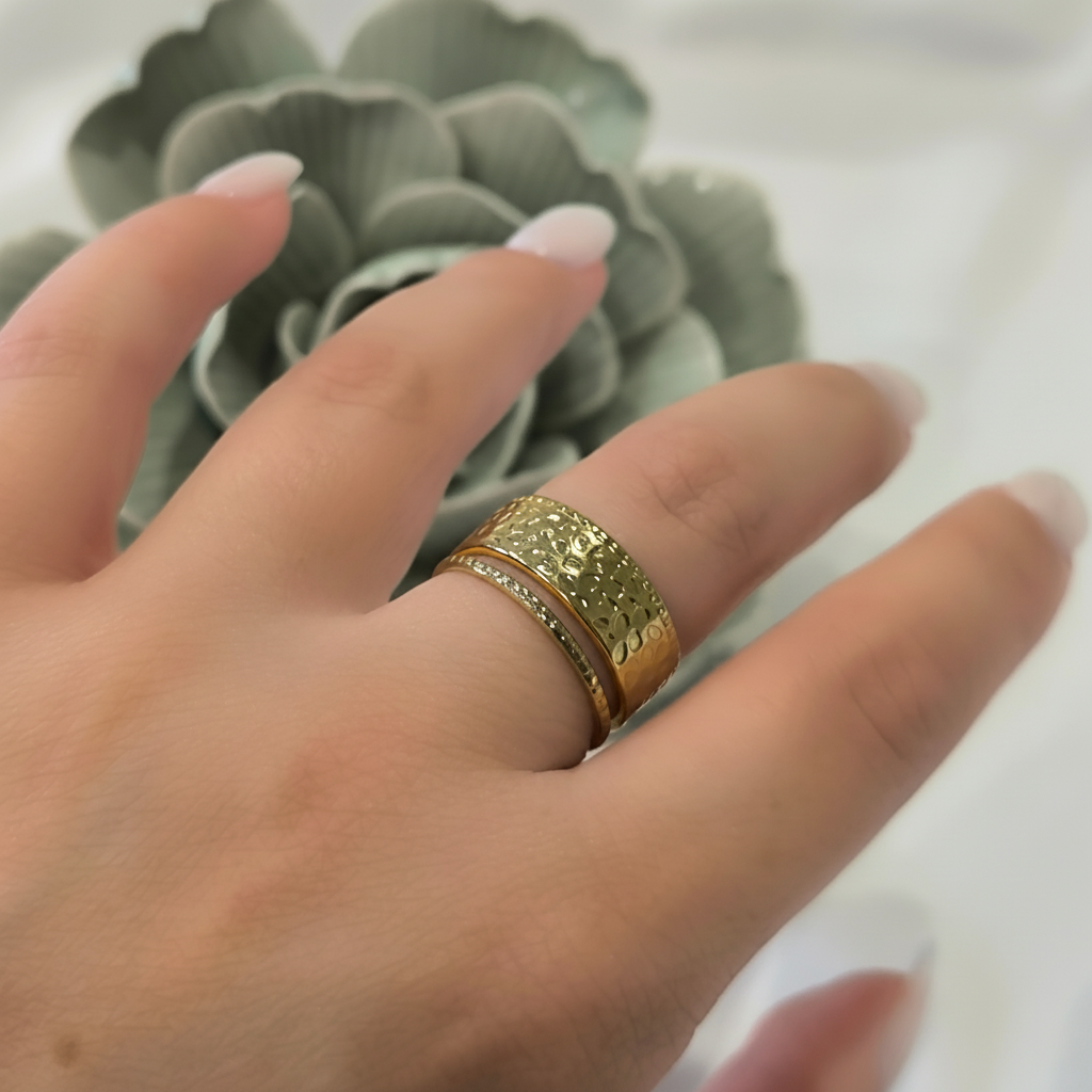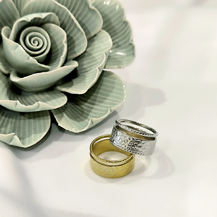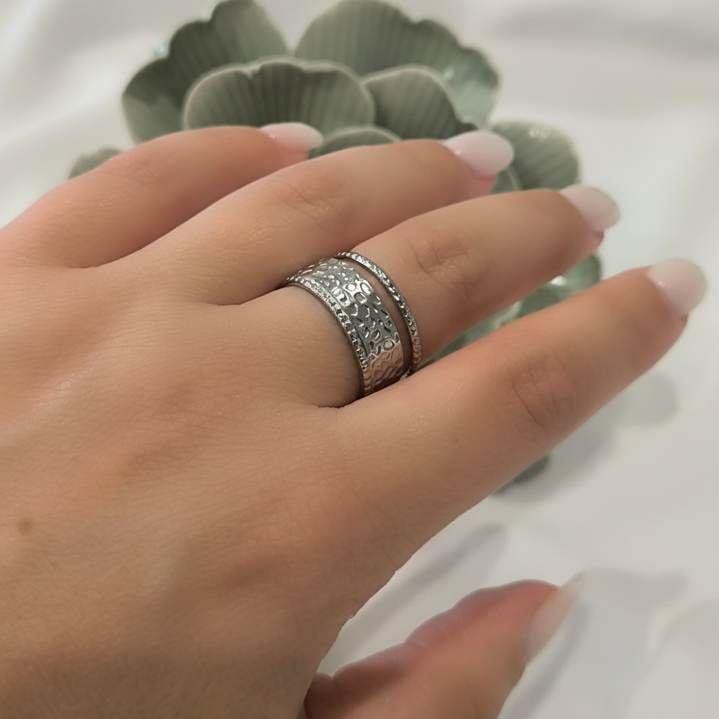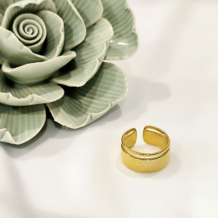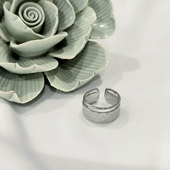 Com textura marcada, esta peça combina presença e simplicidade num equilíbrio perfeito. É um anel que se destaca sem esforço, tal como quem o usa.