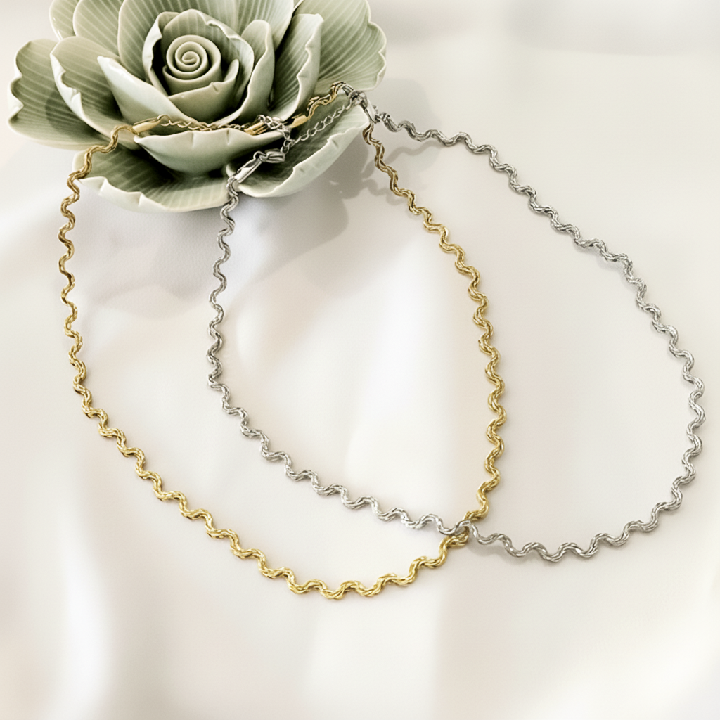 O colar "Wave Line" destaca-se pela sua corrente ondulada, que cria um movimento subtil e elegante. É uma peça leve, moderna e minimalista, ideal para quem procura um toque de brilho discreto no dia a dia.