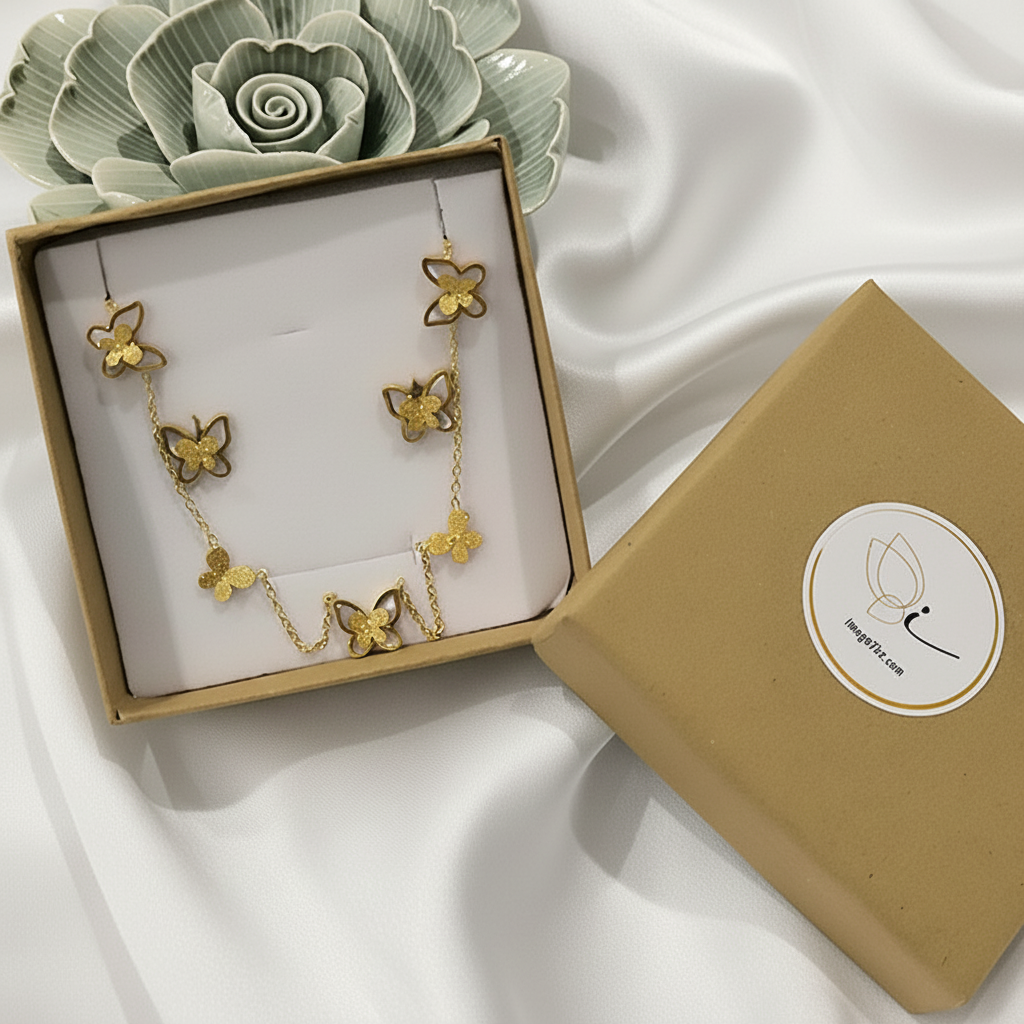 Glow Wings é um conjunto composto por colar e brincos em aço inoxidável, decorados com borboletas delicadas.