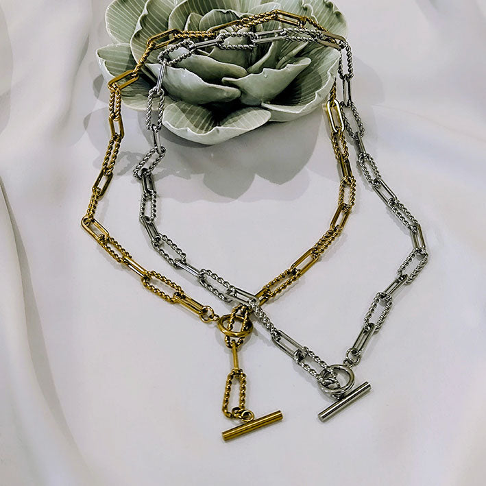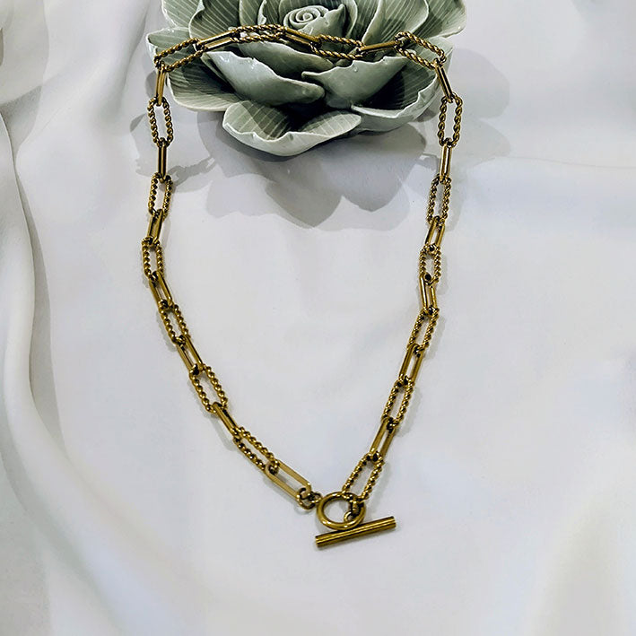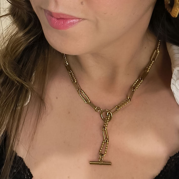 O Magnet destaca-se pelos elos dourados e brilho metálico. Uma peça de presença forte, perfeita para mulheres que querem transformar qualquer look simples em algo absolutamente marcante.