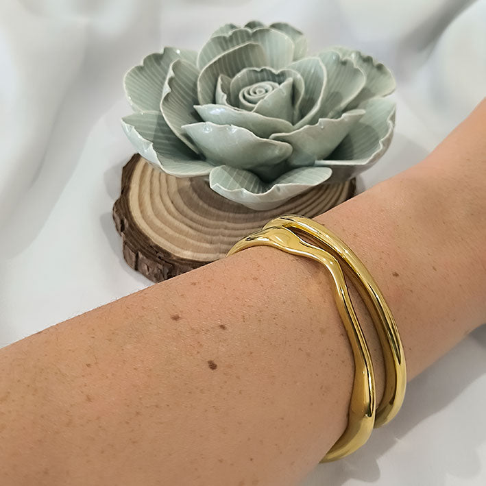 A pulseira Flow é a expressão da ousadia em movimento. O seu design irregular e fluído em aço inoxidável dourado combina sofisticação e irreverência, tornando-a uma peça statement indispensável. Perfeita para transformar looks básicos em visuais marcantes, esta pulseira é ideal para mulheres que vivem a sua autenticidade sem medo de brilhar.